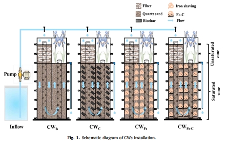 本研究通過構(gòu)建部分非飽和人工濕地(CWs)系統(tǒng),探究Fe-C微電解基質(zhì)對(duì)低碳氮比(C/N=4)廢水中氮磷同步高效去除的機(jī)制。核心發(fā)現(xiàn):