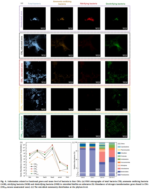 低ORP區(qū)(Fe-C界面)與反硝化菌(DNB)富集位點(diǎn)重合(FISH熒光強(qiáng)度52.9%,圖4a)。