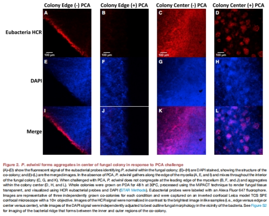 物理共生對的形成:從土壤中分離出真菌-細(xì)菌共生對,真菌在缺乏細(xì)菌時對PCA敏感(抑制濃度>300 μM),而細(xì)菌存在時真菌生長恢復(fù)(圖1B)。