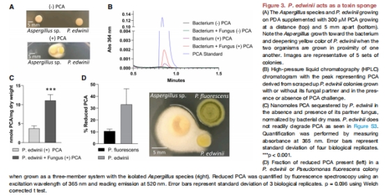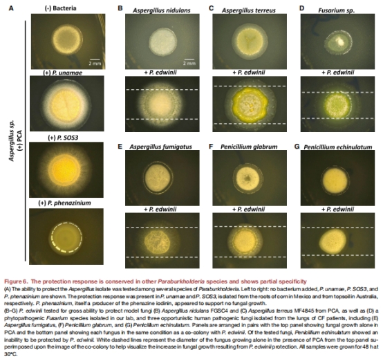 P. edwinii保護(hù)Aspergillus fumigatus(人類病原體)和Fusarium(植物病原體)免受PCA抑制(圖6E, G)。