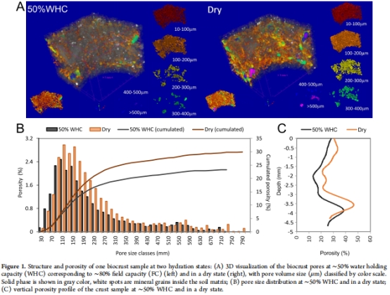 X射線顯微CT:量化不同含水量(50% WHC vs. 干燥)下孔隙分布(圖1A-C)。