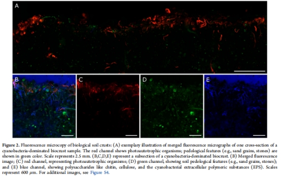 孔隙結構異質性:結皮在干濕循環中呈現穩定的混合孔隙結構(圖1),表層0-0.4 mm為光合自養層(PL),深層為異養層(HL),微生物呈斑塊狀分布(圖2-3)。