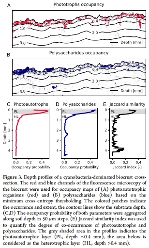 光合自養生物(PL層)和胞外多糖(EPS)在0-0.4 mm深度呈熱點分布(Jaccard相似指數最高0.6)(圖3E)。
