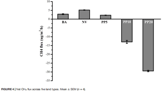 數(shù)據(jù):BA和NV排放CH?(最高達(dá)120 μg m?2 h?1),PP10和PP20吸收CH?(約-20 μg m?2 h?1)。