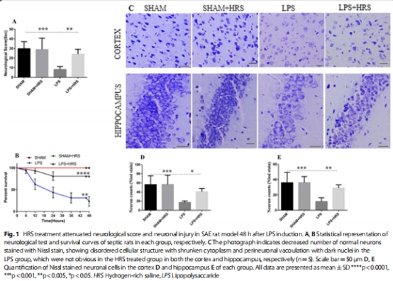 論文研究了富氫鹽水(HRS)對膿毒癥相關腦病(SAE)的神經保護作用: