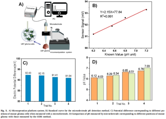 微電極數據重現了腫瘤的酸性梯度特征(中心pH 6.2→邊界7.4),從電化學角度獨立證實糖酵解代謝導致的酸化是膠質瘤的穩定標志,強化SERS策略的生物學基礎。
