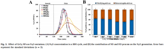 證明CeO? NPs劑量依賴性地抑制BNR(高濃度時顯著降低脫氮效率),并導致溫室氣體N?O排放增加。