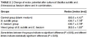 LCBE共培養組Eh=353.5 mV,顯著低于單菌組(B. subtilis: 439.7 mV; E. faecium: 430.7 mV)。