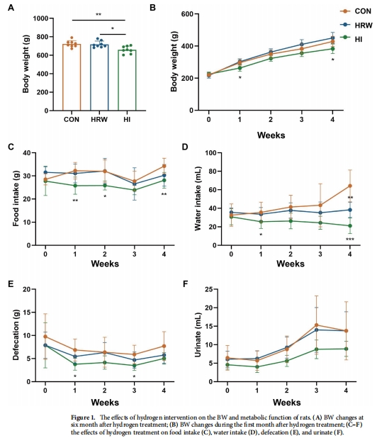 本研究通過6個月干預實驗,對比富氫水攝入(HRW)與氫氣吸入(HI)對健康大鼠腸道菌群和血漿代謝物的影響。