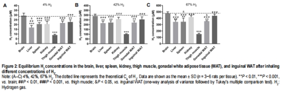 濃度規律:氫氣組織分布呈腦 > 脂肪 > 內臟 > 肌肉,且嚴格劑量依賴。