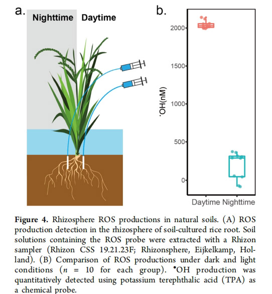1.根際是ROS新熱點:水稻根際存在顯著胞外ROS生成(·OH達10??M),濃度與水生光化學途徑相當,且具晝夜波動性(晝高夜低)。