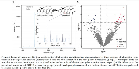 污染物降解(圖5a):ROS導致四環素羥基化產物生成(質譜鑒定)。意義:為根際污染物原位降解提供新機制。