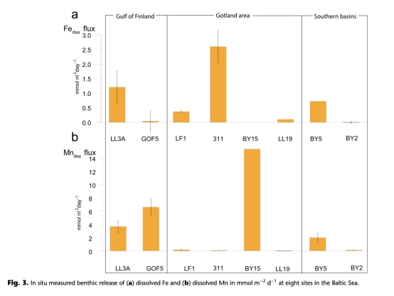 ? 數據:季節性缺氧區釋放最高(Fe: 2.6 mmol/m2/d, Mn: 15.3 mmol/m2/d)