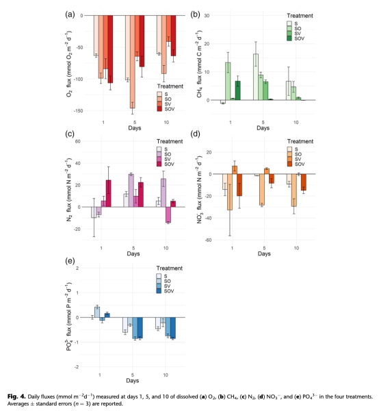 ? 數據:所有處理凈耗氧(-41至-146 mmol O2 m?2 d?1),蠕蟲處理(SO/SOV)耗氧量高于植被處理(SV)。
