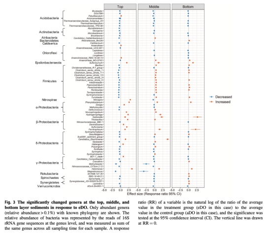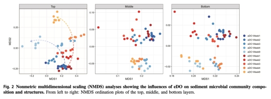 ? 數(shù)據(jù):NMDS顯示eDO顯著改變?nèi)郝浣Y(jié)構(gòu)(Adonis檢驗(yàn)p<0.05,表1);δ-變形菌(含SRB)在中層增加