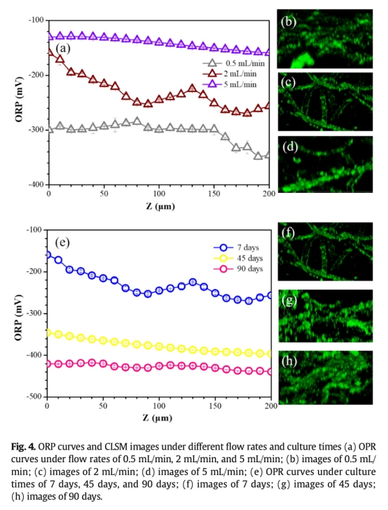 ? 數據:2 mL/min時200μm生物膜內ORP降幅達110 mV(-159.2→-269.9 mV),90天時僅19.1 mV