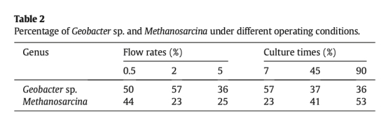 ? 數據:2 mL/min時Geobacter相對豐度57%(0.5 mL/min時為50%),90天時降至36%