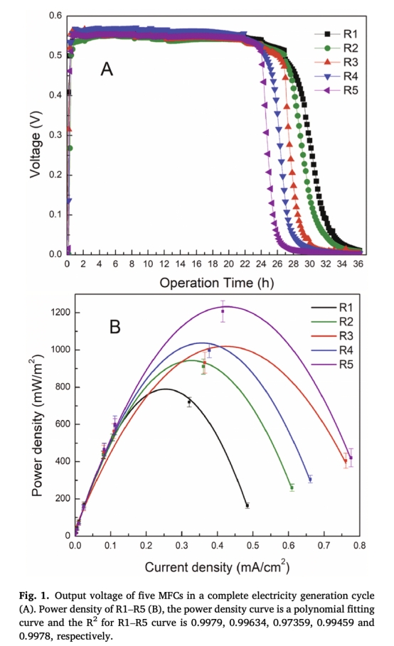 ? 數據:低COD/N組(R5)最大功率密度(1232.54 mW/m2)比無氮組(R1, 790.13 mW/m2)高56%,內阻降低44%(95.85 Ω vs 171.03 Ω)。