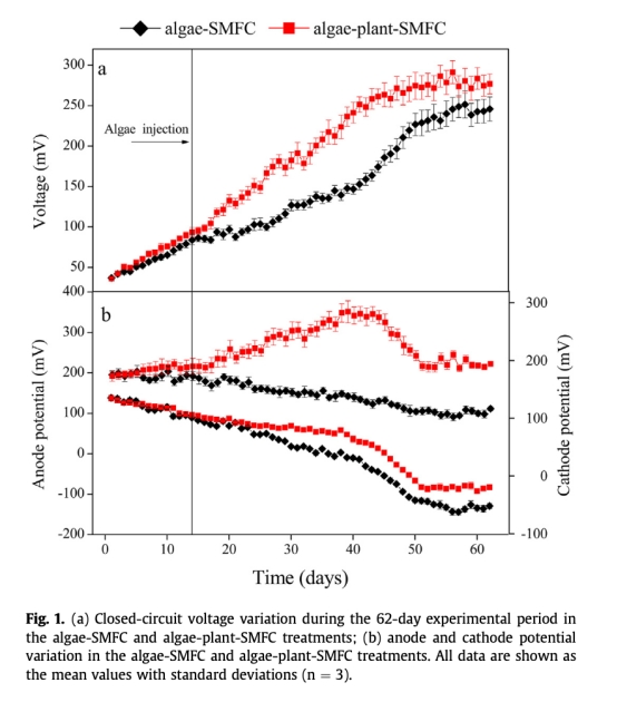 ? 數據:藻類+植物+SMFC組平均電壓(181.4 mV)顯著高于藻類+SMFC組(137.7 mV)。
