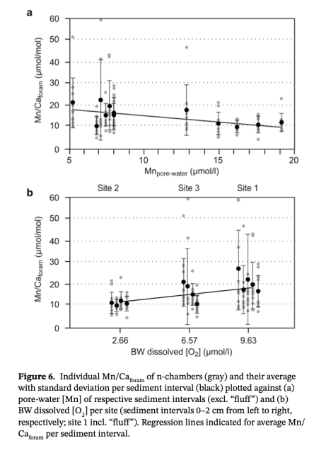 4. 數據關聯:將Mn/Ca與底層水[O?](圖1b, 2a)和孔隙水Mn(圖2b)進行統計相關性檢驗(圖6)。