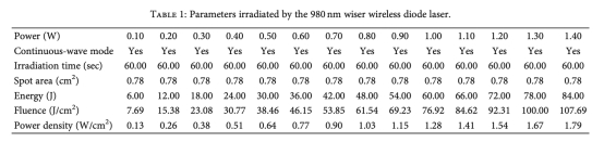 1. 激光參數(shù)設(shè)計(jì):采用980nm二極管激光(連續(xù)波模式),功率0.1–1.4W(0.1W梯度遞增),輻照60秒,光斑面積0.78cm2(表1)。