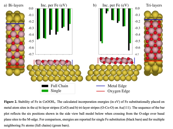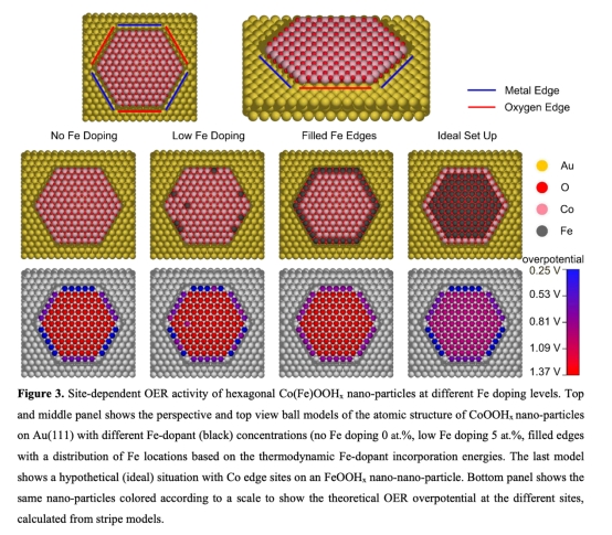 ? 采用DFT計算Fe在不同位置(邊緣/基面)的摻雜能(圖2)及OER過電位(圖3)。結(jié)果顯示Fe優(yōu)先占據(jù)邊緣位點,但Fe摻雜邊緣位點的OER過電位(0.69V)高于純Co邊緣位點(0.30V)。