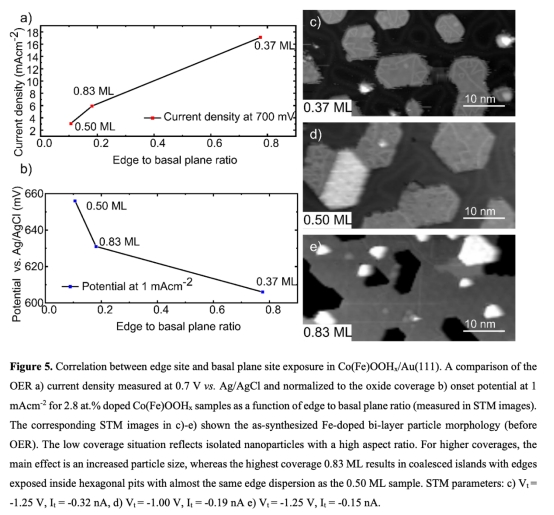 ? 調(diào)控納米顆粒覆蓋度(0.37–0.83 ML),證明OER活性與邊緣/基面位點比例呈線性正相關(圖5),確認邊緣位點為活性中心。