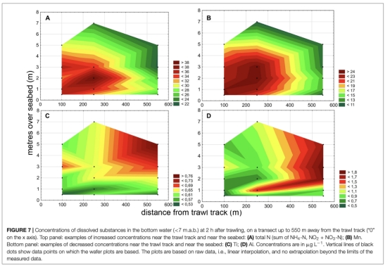 研究通過實地實驗量化了小型拖網在波羅的海泥質海底單次作業的物理擾動和生物地球化學影響。多波束測深顯示拖網形成36米寬的軌跡(含平行溝槽和沉積物堆積),每公里軌跡位移500噸沉積物并懸浮9.5噸沉積物。拖網門對沉積物的單位面積擾動強度是其他漁具的5倍(位移)和2倍(懸浮)。懸浮沉積物擴散至1公里外,形成5-10米厚的渾濁底層水體。拖網后2小時,距軌跡550米處濁度達4.3 NTU(7 mgDW/L),溶解態氮、磷、錳在底層水體中脈沖式釋放,溶解甲烷濃度持續升高20小時以上。拖網軌跡區沉積物生物地球化學在48小時后仍受擾動,表現為氧滲透深度減小及沉積物-水界面營養鹽/氧通量改變。