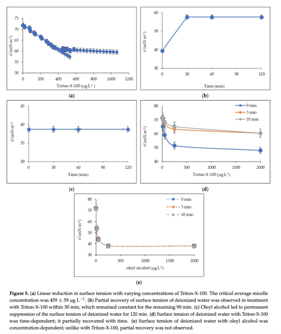 ? 數(shù)據(jù):溫度升高(24°C→55°C)使去離子水表面張力從72降至64 mN m?1;人工表面活性劑(2000μg L?1)使張力降至48 mN m?1(Triton-X-100)和38 mN m?1(油醇)。