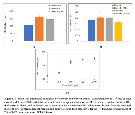 ? 數(shù)據(jù):DBL厚度在添加SML后增至499μm(過濾海水)和283μm(未過濾海水);人工表面活性劑使DBL增厚30%(Triton-X-100)和26%(油醇)。