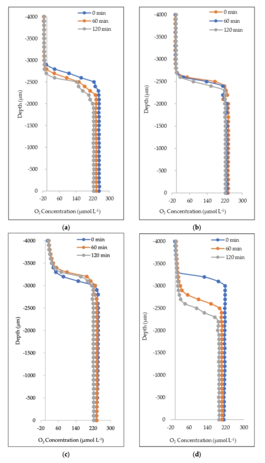 2. 氧氣擴(kuò)散測(cè)量:使用丹麥Unisense微電極(OX-50和TP-200)原位測(cè)量氧氣濃度梯度(圖1),計(jì)算擴(kuò)散速率和DBL厚度(表3-6)。