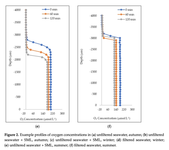 ? 數(shù)據(jù):天然海水和去離子水的氧氣濃度隨時(shí)間變化(例如未過濾海水在120分鐘內(nèi)損失10%氧氣)。