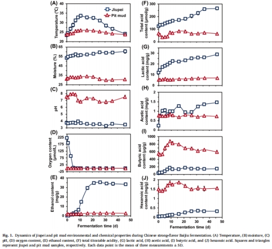 本研究揭示了濃香型白酒發(fā)酵過程中酒醅(jiupei)與窖泥(pit mud)微生物群落的協(xié)同分工機制。通過監(jiān)測窖池內(nèi)環(huán)境參數(shù)(溫度、氧氣、pH)、代謝物(乙醇、有機酸)及微生物群落動態(tài),發(fā)現(xiàn):