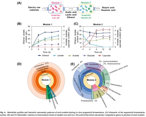 模塊2(窖泥):消耗乳酸生成丁酸(2.9 g/L)和己酸(圖6C)。