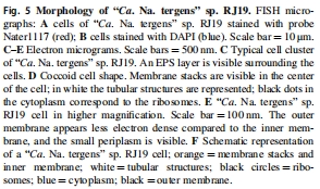 球狀細胞(直徑0.5 μm),胞內膜堆疊(推測為AMO酶位點)。