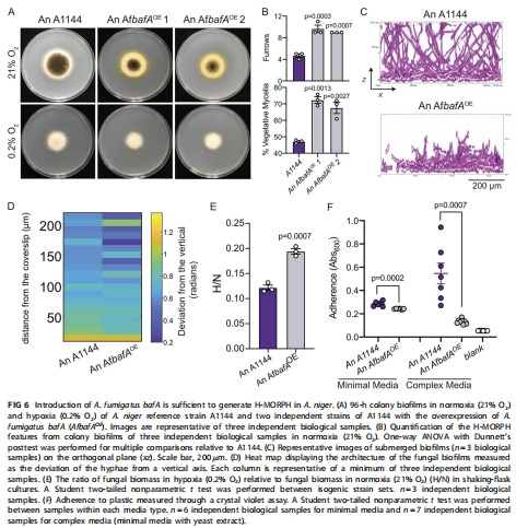 跨物種效應(yīng):將煙曲霉bafA導(dǎo)入黑曲霉(A. niger)可重現(xiàn)H-MORPH表型,增強(qiáng)缺氧生長能力(圖6A-F)。