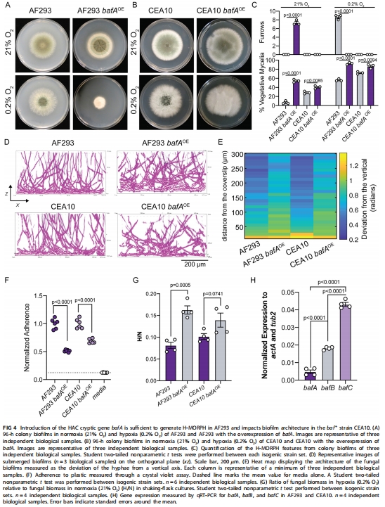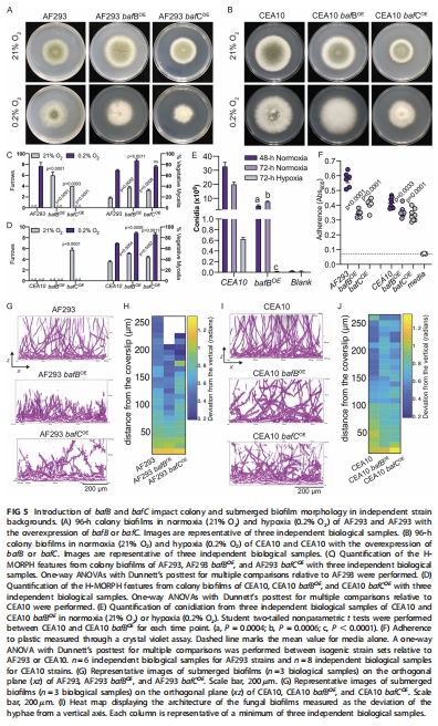 baf基因功能:bafA/bafB/bafC基因的表達(dá)可誘導(dǎo)菌落產(chǎn)生溝槽(furrows),形成缺氧鎖定形態(tài)(H-MORPH),改變生物膜結(jié)構(gòu)(圖1D, 圖3A-B)。