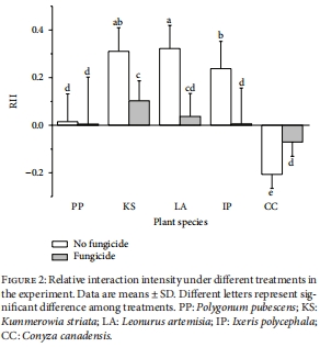 植物互作的非對稱性:AMF增強亞優勢種(雞眼草、益母草、苦荬菜)的正相互作用(RII>0),但加劇優勢種(加拿大蓬)的競爭抑制(RII<0)(圖2)。