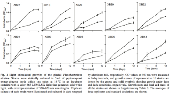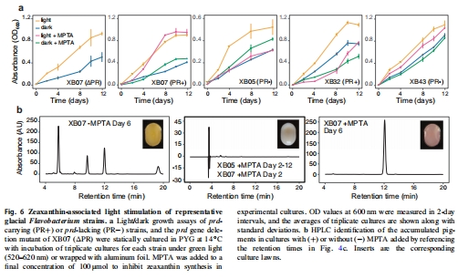 本研究揭示了冰川黃桿菌(Flavobacterium)通過合成玉米黃質(zeaxanthin)響應光照的獨特生長機制: