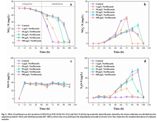 諾氟沙星(0–100 μg/L)顯著抑制硝酸鹽(NO??)去除率(從0.68降至0.44 mg/L/h),并增加N?O排放177倍(圖2)。