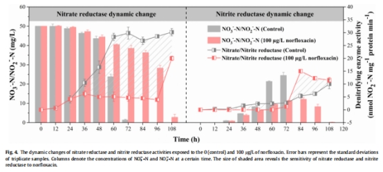 酶活差異調控:NAR對諾氟沙星更敏感(抑制率>NIR),動態酶活監測揭示其通過抑制NAR主導NO??還原受阻。