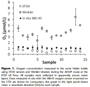 圖1:STOX傳感器(0.25–0.96 μM)與Winkler法(2.56–6.43 μM)的顯著差異,證明常規(guī)采樣導致O?污染(平均偏差3.23 μM)。