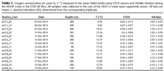 Niskin瓶內O?污染 表1 & 圖1(STOX) 揭示PVC材質滲透導致缺氧水體O?升至0.25–0.96 μM,污染程度與水溫負相關(ρ<0.01)。