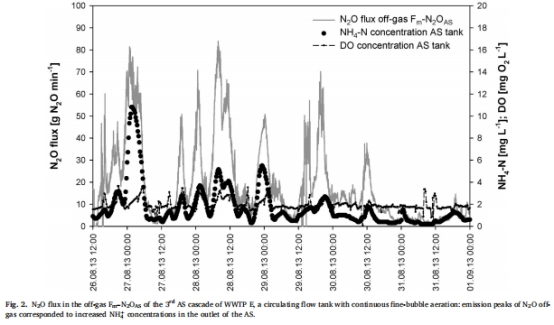硝化是N?O主要來源:好氧階段N?O排放與進水氨氮(NH??)負(fù)荷峰值正相關(guān)(圖1-2),尤其在NH??濃度升高時排放激增。