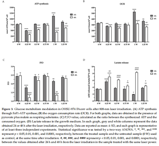 PBM抑制癌細胞代謝:0.25–1.25 W激光照射(60 s,1 cm2)顯著降低線粒體氧化磷酸化(OxPhos)效率(P/O值↓),誘導代謝向糖酵解轉換(乳酸釋放↑)(圖3)。