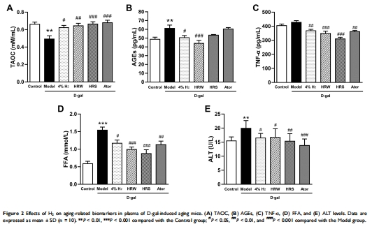 H?顯著改善衰老標志物:提升血漿總抗氧化能力(TAOC↑26–35%),降低晚期糖基化終產物(AGEs↓17–28%)、腫瘤壞死因子-α(TNF-α↓)、游離脂肪酸(FFA↓)和丙氨酸氨基轉移酶(ALT↓)(圖2)。
