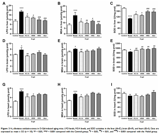 肝臟/腦/心臟中LPO↓、MDA↓、SOD↑(p<0.05),顯示H?直接清除自由基并增強內源抗氧化*。