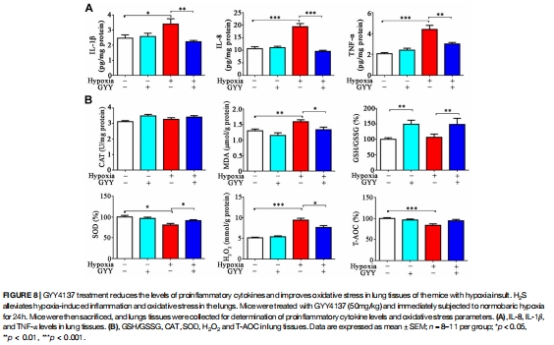 GYY4137恢復(fù)SaO?,降低炎癥因子(IL-1β↓50%,圖8A)及氧化損傷(MDA↓35%,圖8B)。