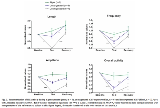 微藻供氧組皮層切片的癲癇樣事件(SLE)活動(頻率、振幅、時長)與常規(guī)氧合組無差異(圖1, 圖2);