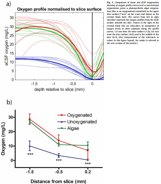 首次繪制腦切片內(nèi)氧空間梯度,證實光合供氧在深部組織的有效性(中部氧濃度10.3 mg/L)。